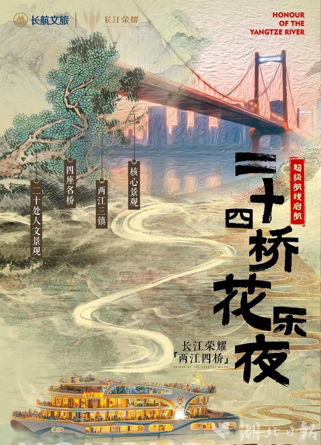 除了场景焕新升级,航行体验也有升级:长江荣耀航线贯穿武汉核心江段,游客可在航行中一览江汉关、黄鹤楼、长江大桥、鹦鹉洲长江大桥等城市地标,更可亲身体验备受央视推荐的“黄金6分钟·过桥仪式”,在音乐与讲解中穿越“万里长江第一桥”,感受武汉独有的浪漫与庄严。