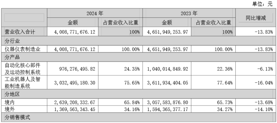 业绩变脸的背后,是核心业务的大幅下滑与资产减值的双重冲击。2024年,工业机器人及智能制造系统收入同比下降16.04%,全资子公司德国克鲁斯受国内重工需求不足、欧洲市场疲软及通胀影响,营收大幅缩水;同时,公司在光伏行业的销售收入也显著下滑。更关键的是,当年公司对普莱克斯、扬州曙光、英国翠欧、德国克鲁斯4家子公司计提商誉减值合计3.45亿元,对应收账款、存货等计提资产减值合计1.22亿元,两项减值合计4.67亿元,直接加剧了亏损程度。