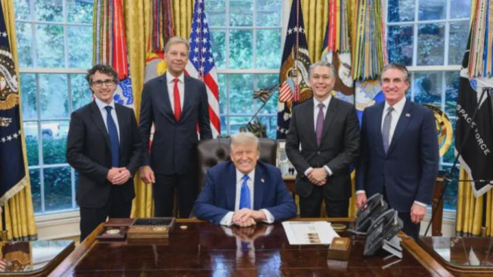 左起:即将上任的力拓首席执行官西蒙·特罗特、现任首席执行官雅各布·斯陶肖尔姆、美国总统唐纳德·特朗普、必和必拓首席执行官迈克·亨利和内政部长道格·博根(